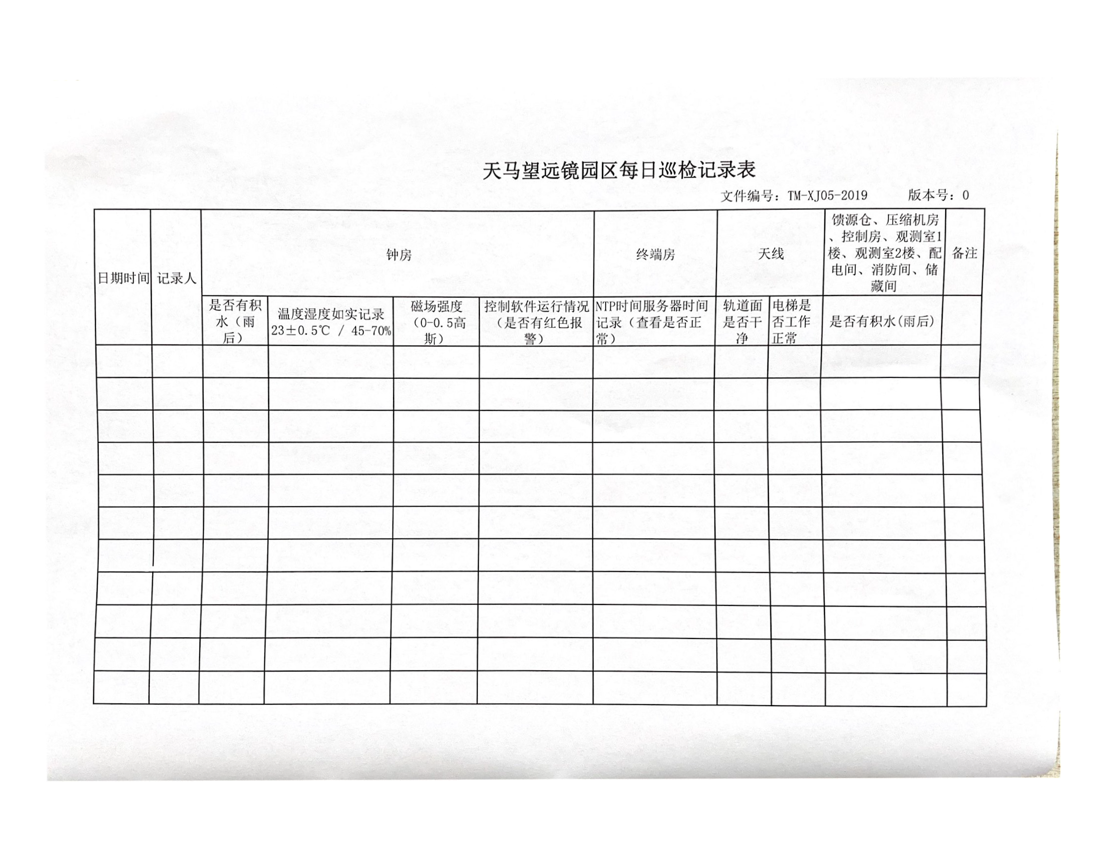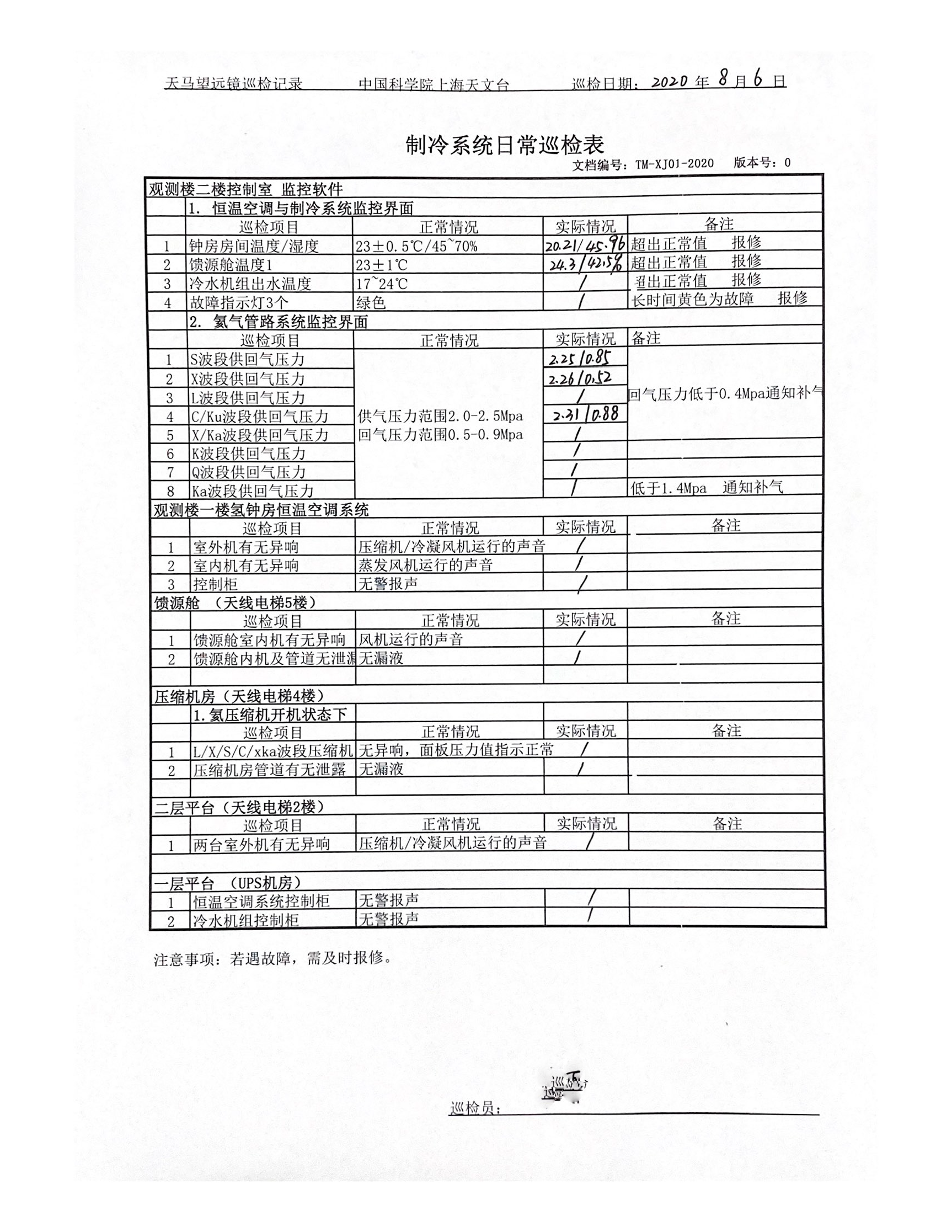 每日第一件事情需要同交接班的同事收集昨日天线故障、问题(接线的改动、设备的零时处理状态等)。在观测室内关注恒温空调与制冷系统的温度是否正常。上天线检查天线运行状态:观测楼一楼氢钟工作状态是否正常、天线一层平台恒温空调和冷水机组是否报警、天线电梯二层平台室外机是否工作正常(异响)、天线电梯4楼各波段压缩机是否工作正常及是否漏液、天线电梯5楼馈源舱内室内风机是否工作且空调管路是否有漏油(见图下位机)。