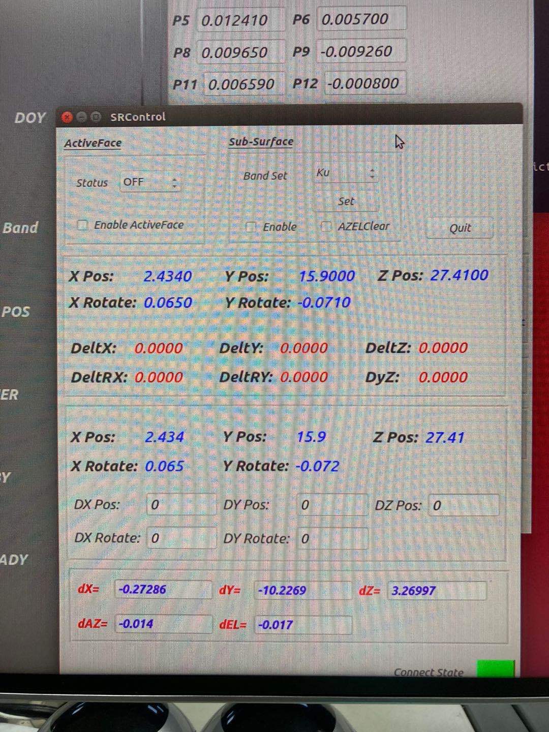 通常在高频也就是Ku之上的频率会选择主动面和副面开启工作。即勾选Enable ActiveFace 和 Sub-Surface中的Enable。当不使用副面的时候要勾选AZEClear,使得副面恢复初始状态。还有需要核对面板中上下俩组数值是否相同,即命令值和实际值(因为有可能存在六连杆机械故障,使得六连杆无法归位)。