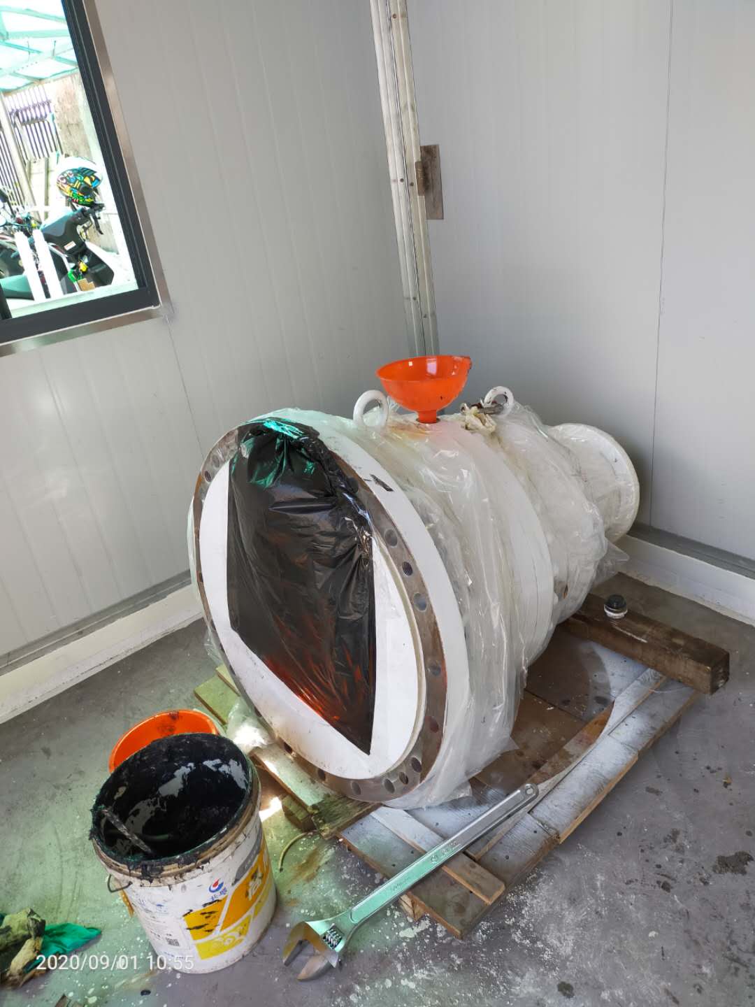 在减速器的顶部有俩个注油空,使用大号活动扳手或者套筒旋开,然后通过漏斗注油。需要注意,减速器在天线上正常工作时,才用飞溅润滑。所以润滑油液位只需要高过减速器侧边视窗即可,但是此次保养是贮存保养。为了避免内部行星齿轮组被水汽锈蚀,选择把润滑油注满。使用30L油桶大约3桶就可以注满。